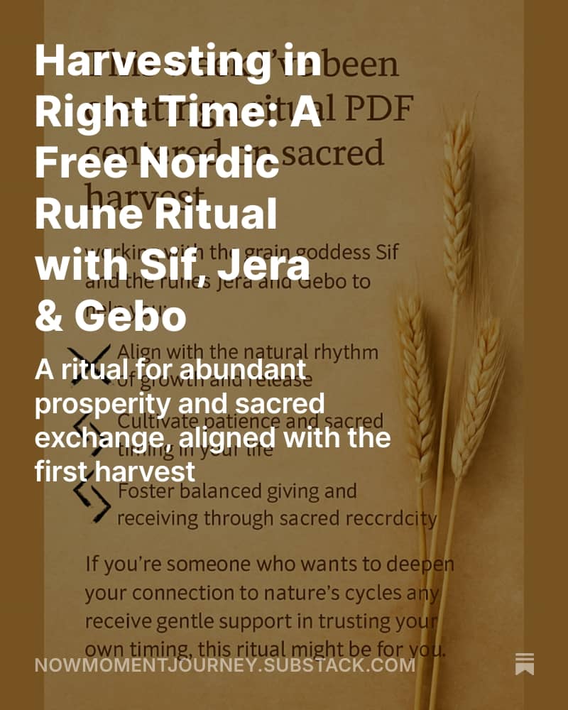Free Nordic Rune Ritual for First Harvest - Sacred Timing with Sif, Jera & Gebo 🌾 Hi everyone — As August 1 approaches — the sacred time of Hlæfmæst (Nordic first grain harvest) — I've been reflecting on how often we feel pressure to produce and give, even when we're not fully ready. But the rune Jera ᛃ teaches us: sacred timing matters. The harvest comes after the tending. The rune Gebo ᚷ reminds us: sacred exchange works when both sides are nourished. If you're waiting, pausing, or...